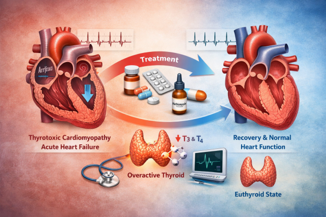Тиреоїдні гормони мають значний вплив на серцево-судинну систему, а їх надлишок може призводити до розвитку тяжких кардіальних ускладнень. У деяких випадках тиреотоксикоз стає причиною серцевої недостатності, яка спочатку сприймається як первинне кардіологічне захворювання. Особливий клінічний інтерес становлять ситуації, коли після лікування тиреотоксикозу функція серця істотно покращується. Саме такий випадок описано у статті Reversible acute heart failure induced by thyrotoxic cardiomyopathy.